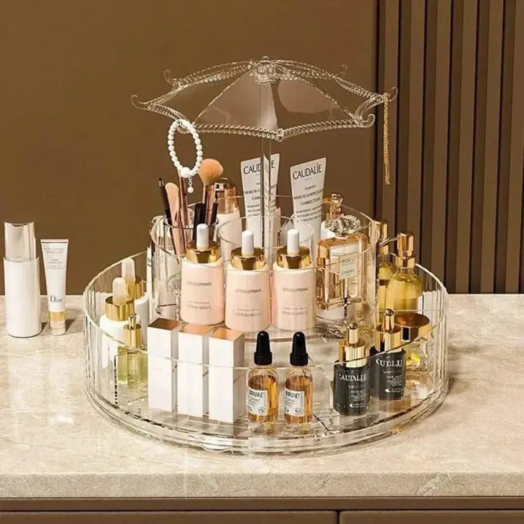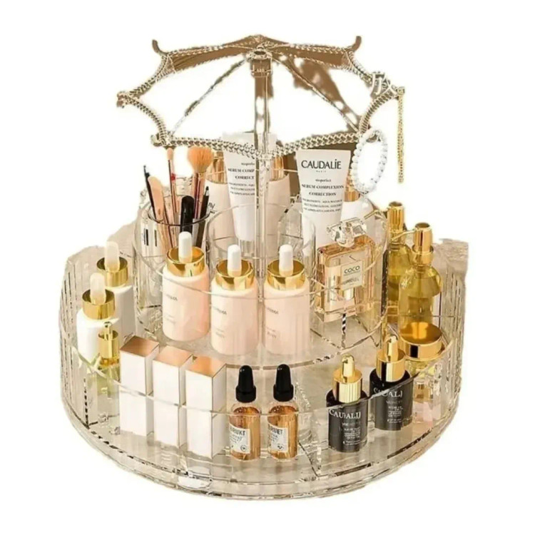 یه استند میخواستن که هم بتونن لوازم آرایشیشون رو نظم بدن هم یه جا جواهری دم دستی باشه. کار شیک و جمع و جور که شامل استند لوازم آرایشی و جا جواهری زیر کار است و گردونه چرخون داره که دسترسی به کل وسایل رو راحتتر میکنه.