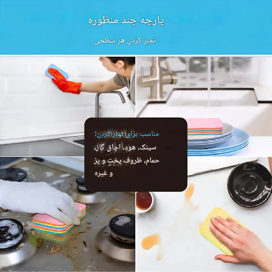 اسفنج نظافت سوپر میکرو که با فناوری جدید خود به هیچ عنوان هیچ ردی از خود به جا نمی گذارد و با قدرت جذب بالای خود تمام آلودگی ها را از سطح آشپزخانه، اجاق گاز، ماکروفر، سینک، سرویس و حمام و خودرو بدون ایجاد خش و جای دستمال نظافت میکند و بعد از اتمام کار میتوانید یک لایه را جدا کنید و از لایه بعدی برای نظافت اینده استفاده کنید.